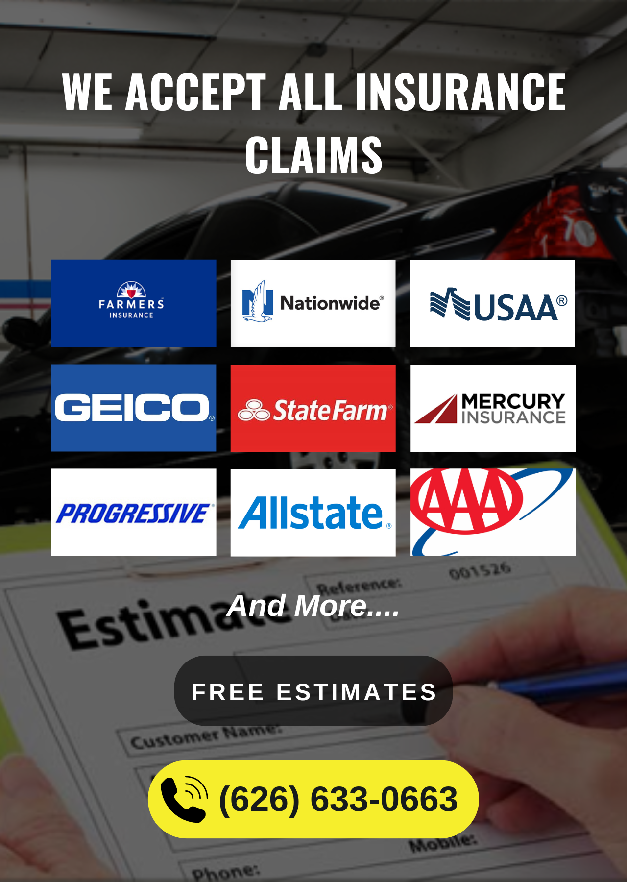 No matter what insurance company you're with—whether it's State Farm, Geico, Progressive, Allstate, or any other—we make the process easy. We handle all paperwork and communicate directly with your insurer to get your claim processed quickly.We understand that getting your car back on the road is a priority. That's why we work quickly and efficiently, keeping you informed throughout the entire repair process.